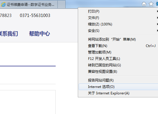 点击浏览器菜单栏的“工具”菜单,在下拉菜单中选择“Internet选项”,如图所示;