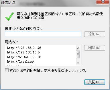 在弹出的可信站点窗口中,将当前访问的站点添加到网站列表中(